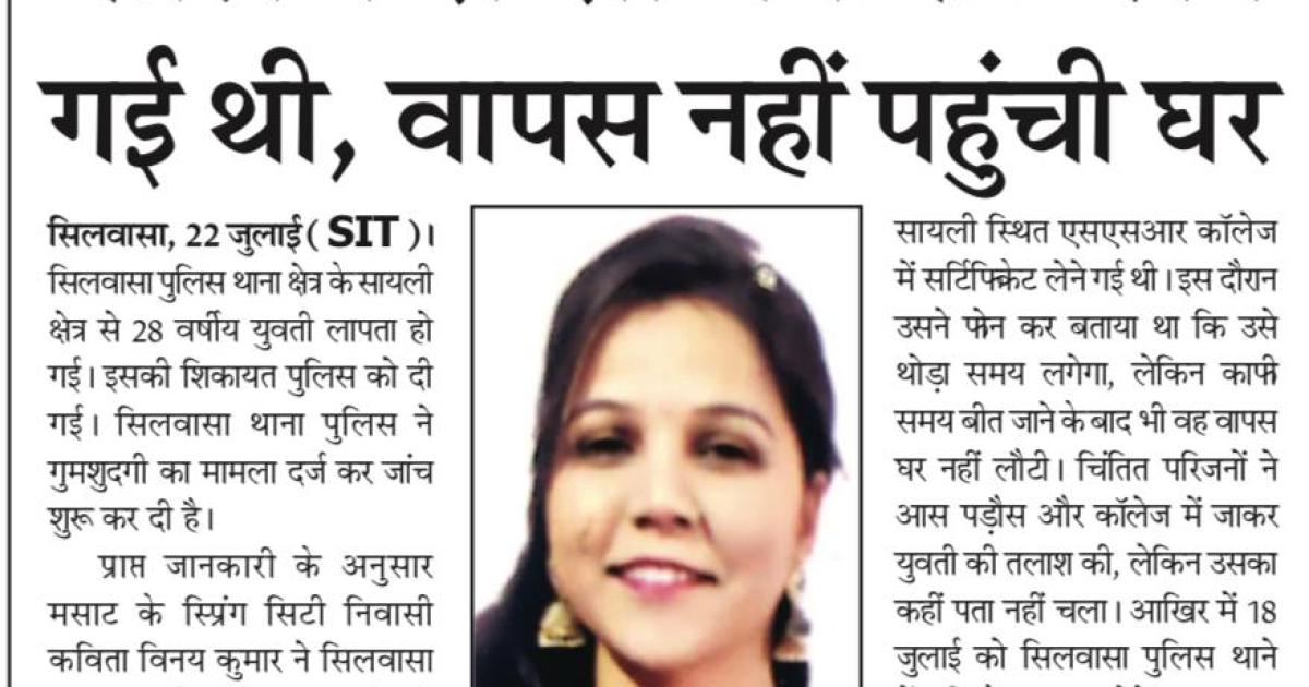 Shruti is missing since 16.7.2025 from SSR College Silvassa DNH.